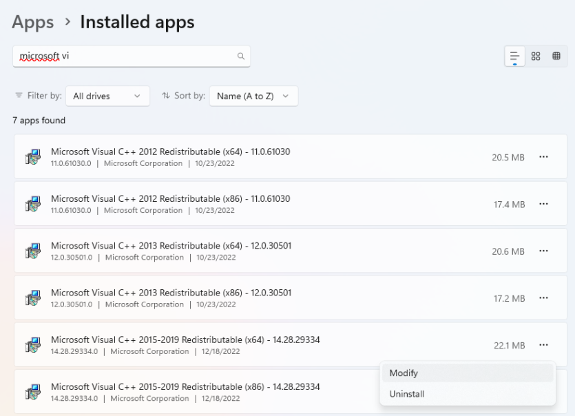 windows key with x key -> installed apps -> find Microsoft Visual C 2015-2019 Redistributable (x64 or x86) -> modify - reboot -> happy